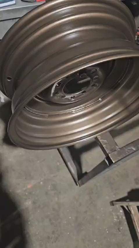 Tyres taken off, complete removal of old paint, thorough repairs of kerb damage, scratches, and scuffs. Powder coated finish applied, followed by refitting of tyres and precise rebalancing.